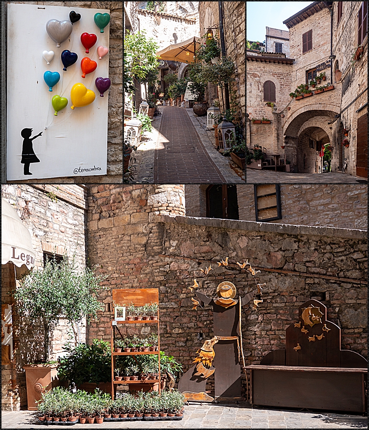 Assisi has always been a special place of pilgimage but since the 17year-old Carlo Acutis was canonized there on 7th September 2025 the town has attracted even more Catholic followers. His tomb is in the Shrine of the Renunciation which we didn’t visit. The town itself is steeped in history and was well worth dodging the crowds to look around. Small shops, many of them selling souvenirs line the narrow cobbled streets. After a while we decided to head out of town and find a quieter place for lunch. The small village of Spello was perfect. We sat on a sunny corner, enjoying a delightful lunch washed down with a carafe of wine. Spello is known as the ‘city of flowers’ and many of the streets and balconies are filled with plants and flowers. It’s a popular destination, known for its Roman and mediaeval architecture (along with other hilltop towns), but the annual Flower Festival in late spring attracts hundreds.