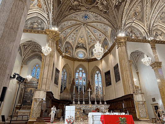 The Cathedral of San Lorenzo was our next stop whci is next to the Galleria. The exterior with its pink marble looks as though the building isn’t finished which in fact it wasn’t as in 1587 work stopped, they did finish the interior of the cathedral though. Inside there are three naves separated by massive pillars but the most notable feature is the intricately decorated ceiling. I don’t think we did justice to the Cathedral but we had to get on and we had one more thing to do.