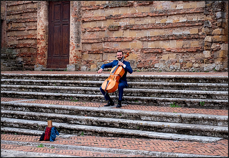 It was quite a steep walk down into Montepulciano but all very interesting. As we got nearer to the centre we could hear music being played and there on the steps of a large ancient building was this chap playing his cello. The sound bouncing around the walls of the piazza attracted quite a crowd and was the perfect setting for his music.