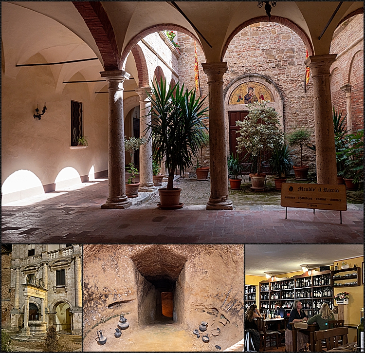Some of the features of Montepulciano including a deep cave inside one of the shops and a very well-stocked wine store with apparetly over 600 labels!