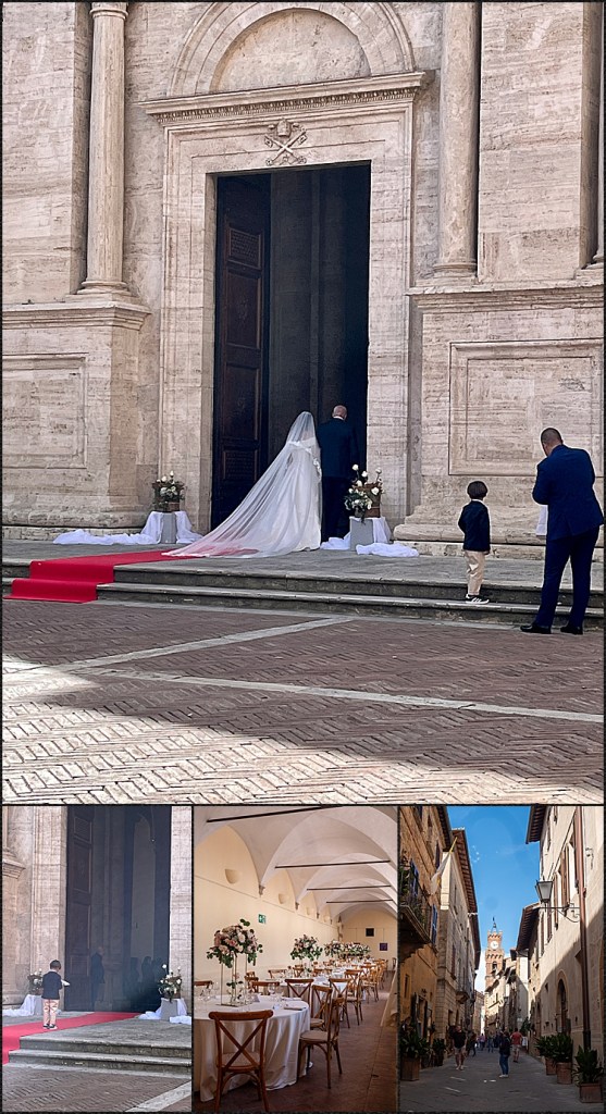 Breakfast again at the excellent Alma Cafe before leaving Montepulciano and moving on to Siena. It was a Saturday morning and true to form on our holidays, we came across a wedding. Sometimes I think it’s because I was a wedding photographer and although I’m retired, I can’t escape them. We stopped to look round Pienza, another interesting town in Tuscany with a large cathedral and buildings in the Renaissance style. It’s a compact town with some great local shops and beautiful views. The wedding was at the town’s very impressive Cathedral and of course the wedding attracted quite a crowd. Once the bride had gone inside, the doors closed and for a short while the young page boy stood outside on his own. I wonder if he was nervous? Those doors look very big even to an adult. We crept in through the side entrance and watched for a while and then started walking back to the car where we saw where the wedding breakfast was being set up with tables beautifully decorated. It was a perfect setting, and yes, I had to take a picture!