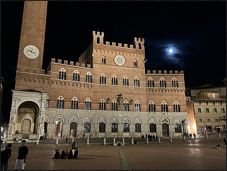 After lunch and another wander round in the heat we sauntered back to our hotel to take advantage of the swimming pool and catch up on some reading. Had a couple of wines in the evening at one of the cafes which line the Campo enjoying looking at the people going by and tracing the moon going across the sky behind the Palazzo Publico. This is a magical place whatever the time of day or night.