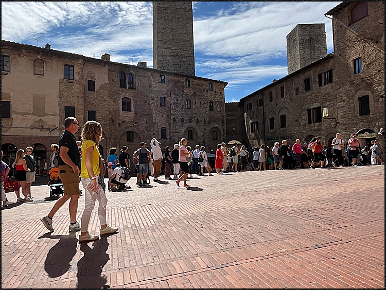 After our exertion up and down the tower we headed for a cafe in the central Piazza della Cisterna and enjoyed a beer and a pleasant lunch. The square is also home to the Gelagteria Dondoli which they claim is the ‘World’s Most famous Ice Cream’. Whether that’s true or not it’s fame is well known going by the enormous queue which went right across the Square from the tiny doorway of the Ice Cream Shop. It was a hot day but I imagine that every day during most of the year there is a long queue outside.