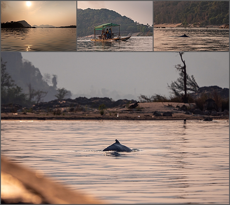 Before we had our meal we decided to hire a boat to see the freshwater Irrawaddy Dolphins. Again a little confusing as they live in the Mekong close to the shoreline. These dolphins are so endangered that WWF estimates that in the river between Laos and Cambodia there are only around 90 left. It costs about 9USD for an hour’s trip and together with the possible sighting of a dolphin or two, you get to see a beautiful sunset. The boatmen know exactly where to take you. There were only a couple of other boats around and when a dolphin is spotted everyone converges to that spot. They say sightings are pretty certain and especially when the river is low because the dolphins stay close to the shore. It’s so hard to take a picture of them as you’re excited when they appear and of course they dive back into the water quickly. However it was magical to see them and what a precursor to an excellent Thai curry at the guesthouse.