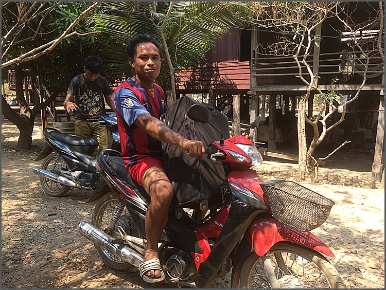 It’s a little confusing as normally you can get a ferry direct to Don Khon but because the Mekong was so low they were not running and so the only ferry was to the neighbouring island Don Det. These two islands are connected by a bridge and the only way we were getting to our guest house was by motorbike taxi. Neither my man nor I had been on a motorbike since the ’70’s! I was a little apprehensive but was assured that my young driver was very experienced. Did I enjoy the twenty minute trip down the unmade sandy tracks – you bet!