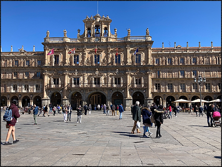 We didn’t linger long walking through the main shopping area although we did stop to admire the tall buildings which line either side of the street. It was getting on for lunchtime and we were aiming for the magnificent Plaza Mayor, one of the grandest and most imposing squares in all of Europe. The square has been an important meeting place for the citizens and students of Salamanca for centuries. This is where you go to enjoy a coffee, a wine, meet a friend or take a stroll around the square passing all of its 88 arches.