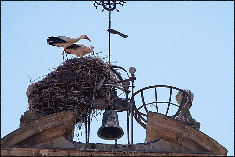 Carrying on, the views from the top of the old Cathedral are well worth the climb including being almost level with one of the many pairs of nesting storks you see at the top of buildings in Salamanca.
