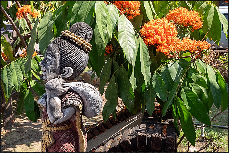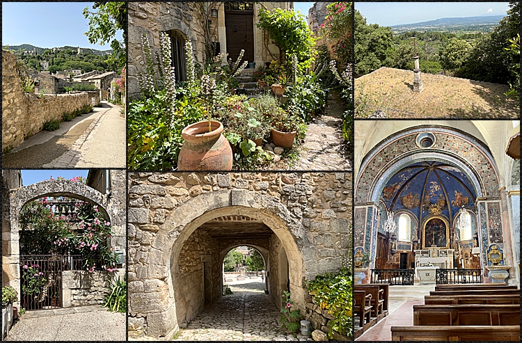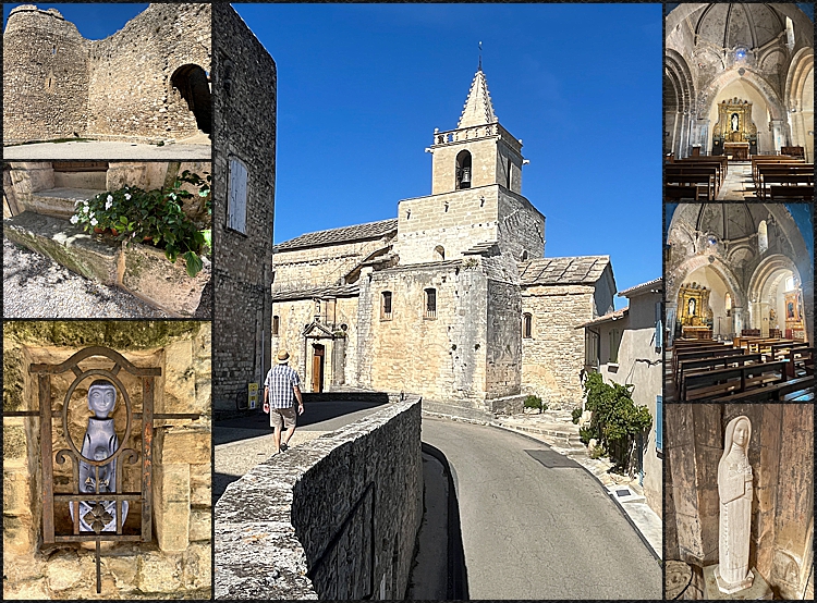 At other times Venasque is a quiet place to visit. You walk through the arch of the ramparts with its Roman towers and walk over to the Esplanade where there’s a fabulous view. From there we walk along the narrow paths to the Romanesque church of Notre Dame which (to me) has a special atmosphere and in there is one of my favourite statues. There’s also a Baptistery with the entrance around the back of the church which is apparently one of the oldest religious sites in France. The villagers obviously take pride in their village; there are flowers everywhere and interesting statues to spot as you walk along and in the little courtyard gardens too. We used to sit by the fountain and have a drink but this time we were told we would have to order a meal. We were a bit surprised as there was hardly anyone around however we walked across the road to Le Petit Chose and enjoyed a glass of wine and the view from the terrace there.