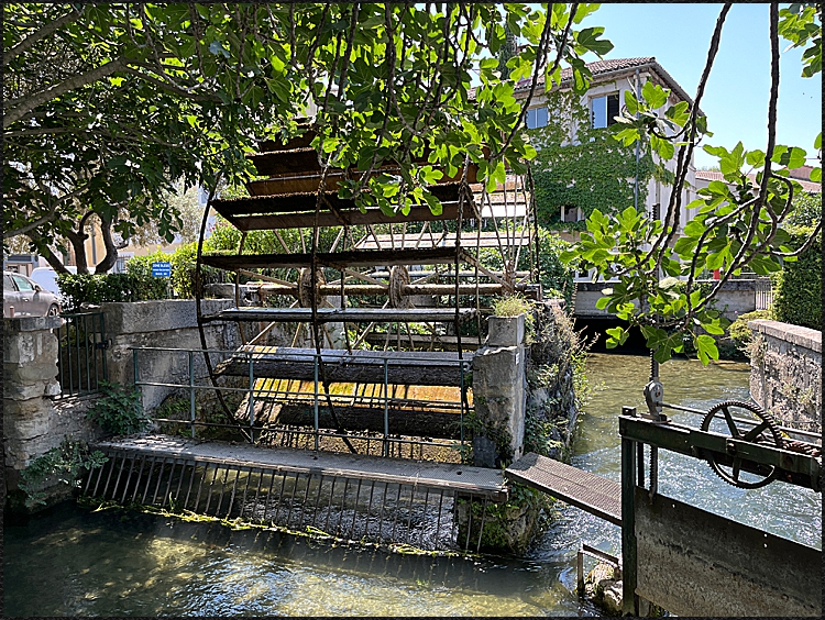 Towards the end of our holiday we arranged to meet a friend in the nearby town of L’Isle sur la Sorgue. The town is famous for the many canals that weave through the centre, some with waterwheels and little bridges going across. The town is known as ‘Little Venice’ and you can see why. The clear waters of the Sorgue with the ferns gently swaying with the current is wonderful to watch and memerising when you look down from one of the many bridges. We always walk up to the end of the main street to see how much water is flowing into ‘Le Basin’. Along that street are many cafes with tables set out along the frontage and alongside the river. It’s a popular tourist area and is always busy. If you visit the town on a Sunday however it is packed with people who have come, not just to go to the market but also to browse the many stalls selling bric-a-brac. In the height of the summer it’s difficult to park and hard to see anything at all for the crowds. There may be bargains to be had in this ‘flea market’ but for anyone looking for an antique you do have lots of choice as there are nearly 300 antique dealers in the town!
